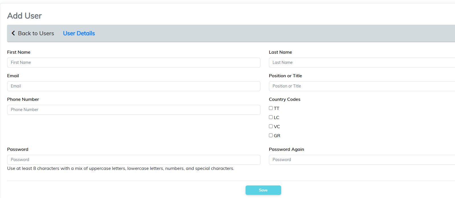 - Country Codes – Tick applicable countries for which this user should have access (e.g., TT, LC, VC, GR).