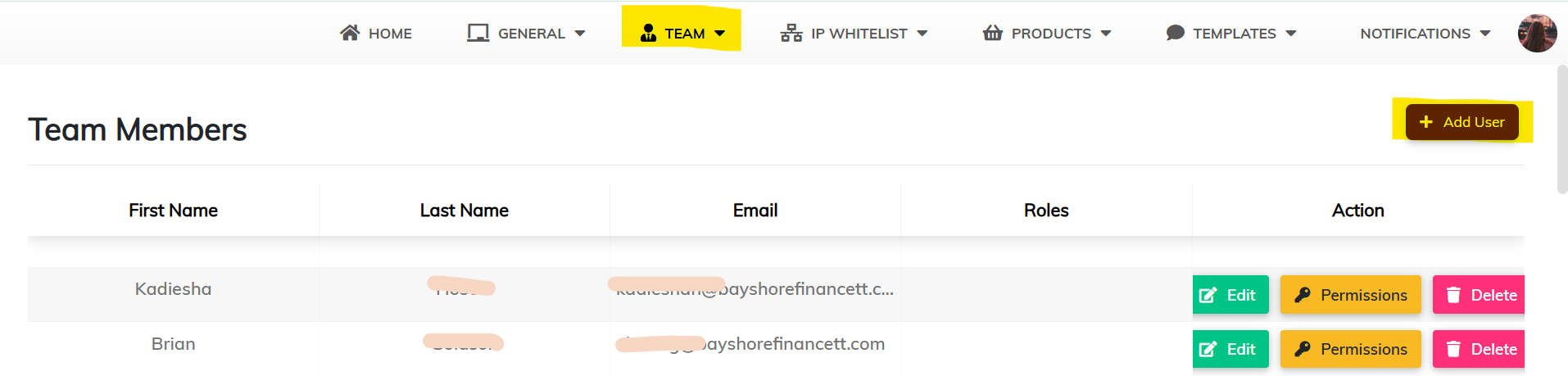 Administrators can add users with specific credentials and permissions to the Admin Portal. Each user account includes personal details, country access, and role-based or custom permissions.