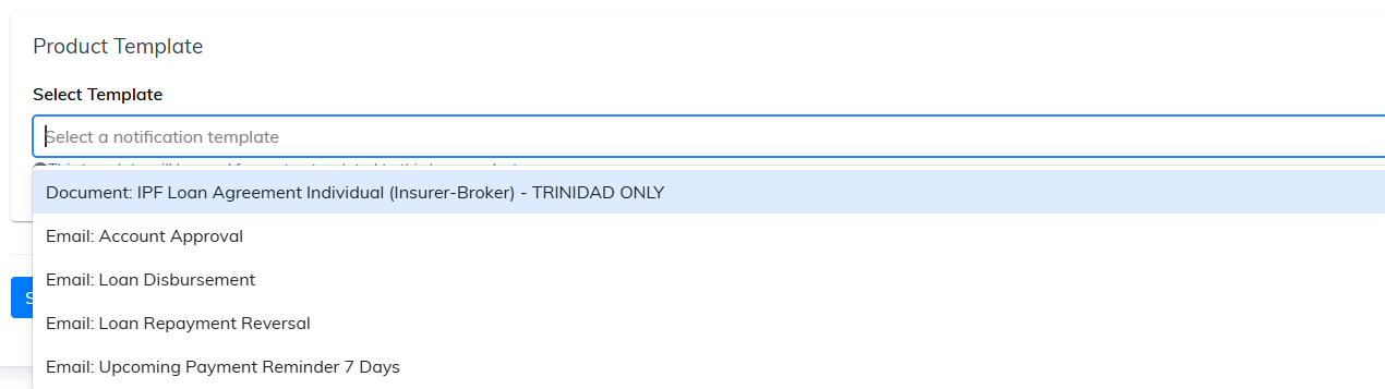 Choose a notification template (e.g. Document or Email) to be associated with this product. These templates are created in the Template section of the admin portal.