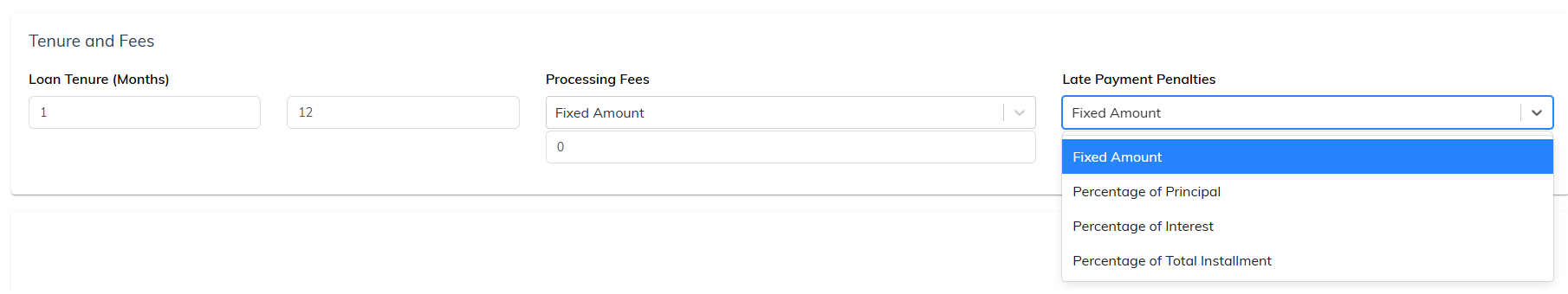 Select a penalty type: - Fixed Amount, - Percentage of Principal, - Percentage of Interest, - Percentage of Total Installment