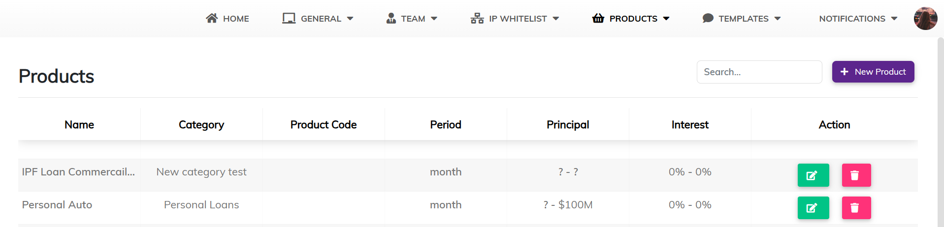 The Products section provides an overview of all loan products currently configured on the platform. Each product entry includes essential loan details such as the category, product code, loan period, principal range, and interest rate.
