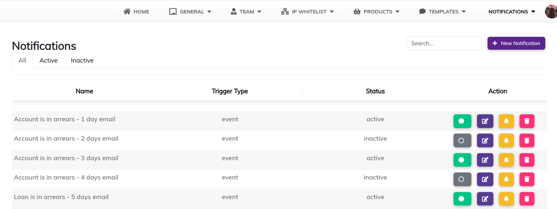 View all notifications or filter by Active and Inactive status