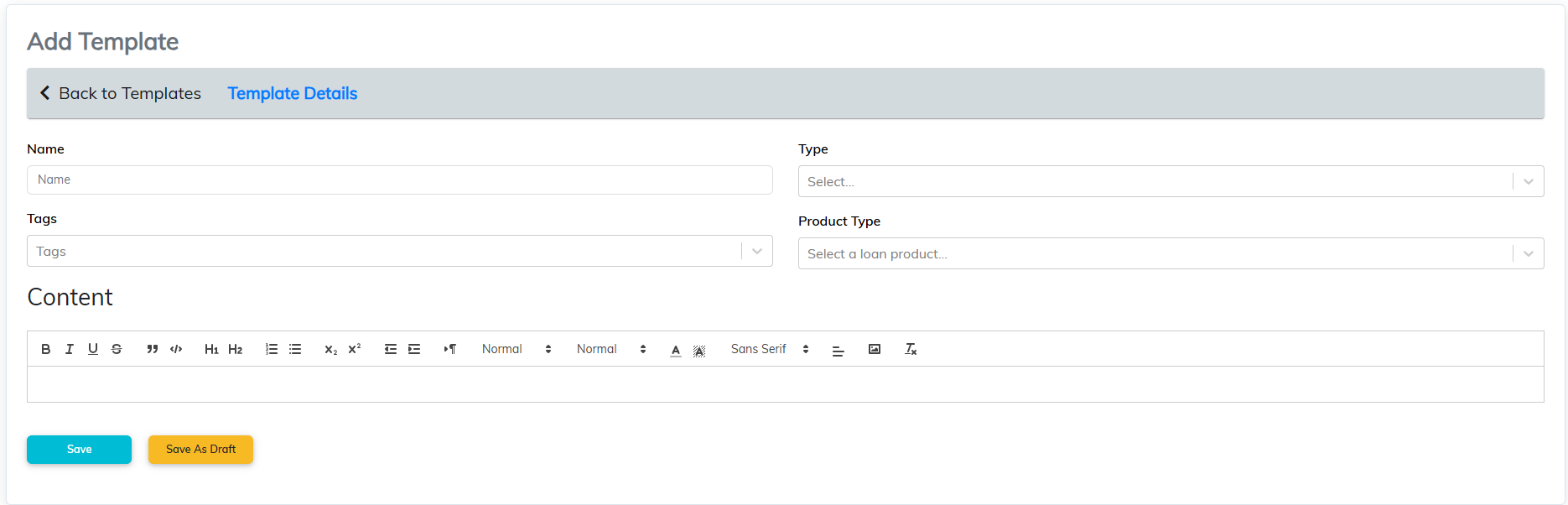 The Add Template screen allows administrators to create new templates for various communication types (Email, SMS, Document, Call). These templates are used in client notifications and can be associated with loan products or tagged for easy management.
